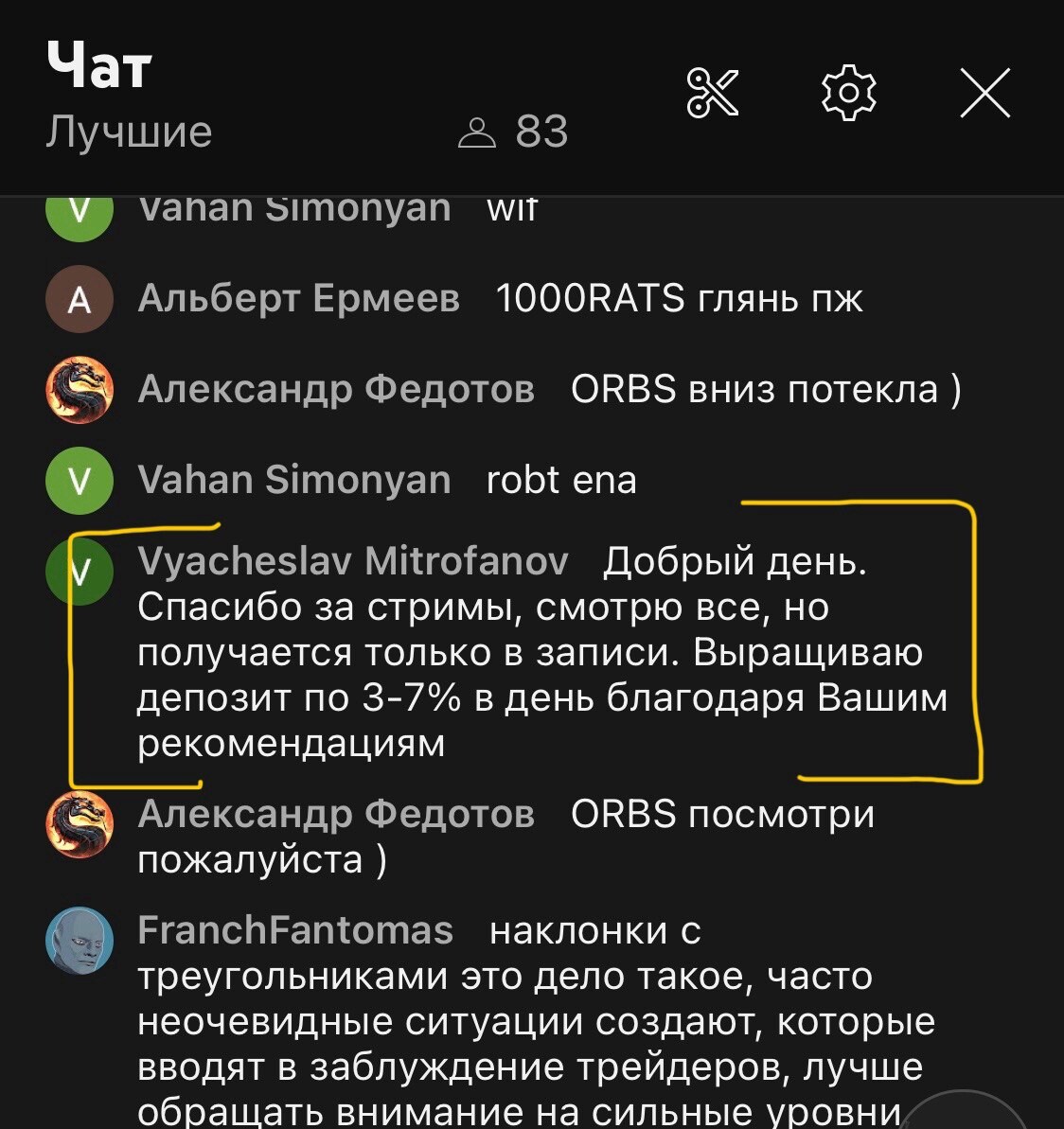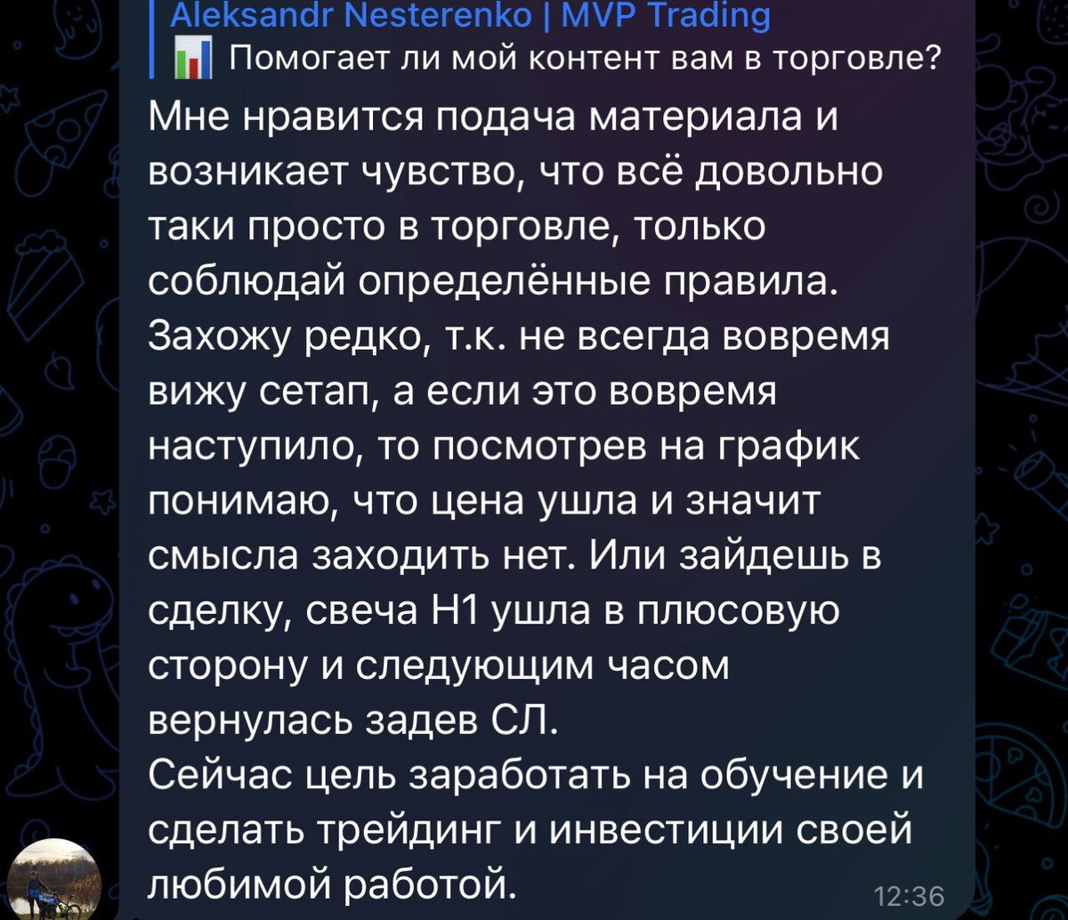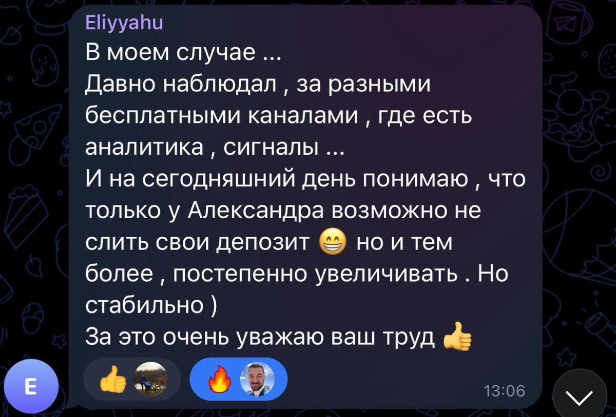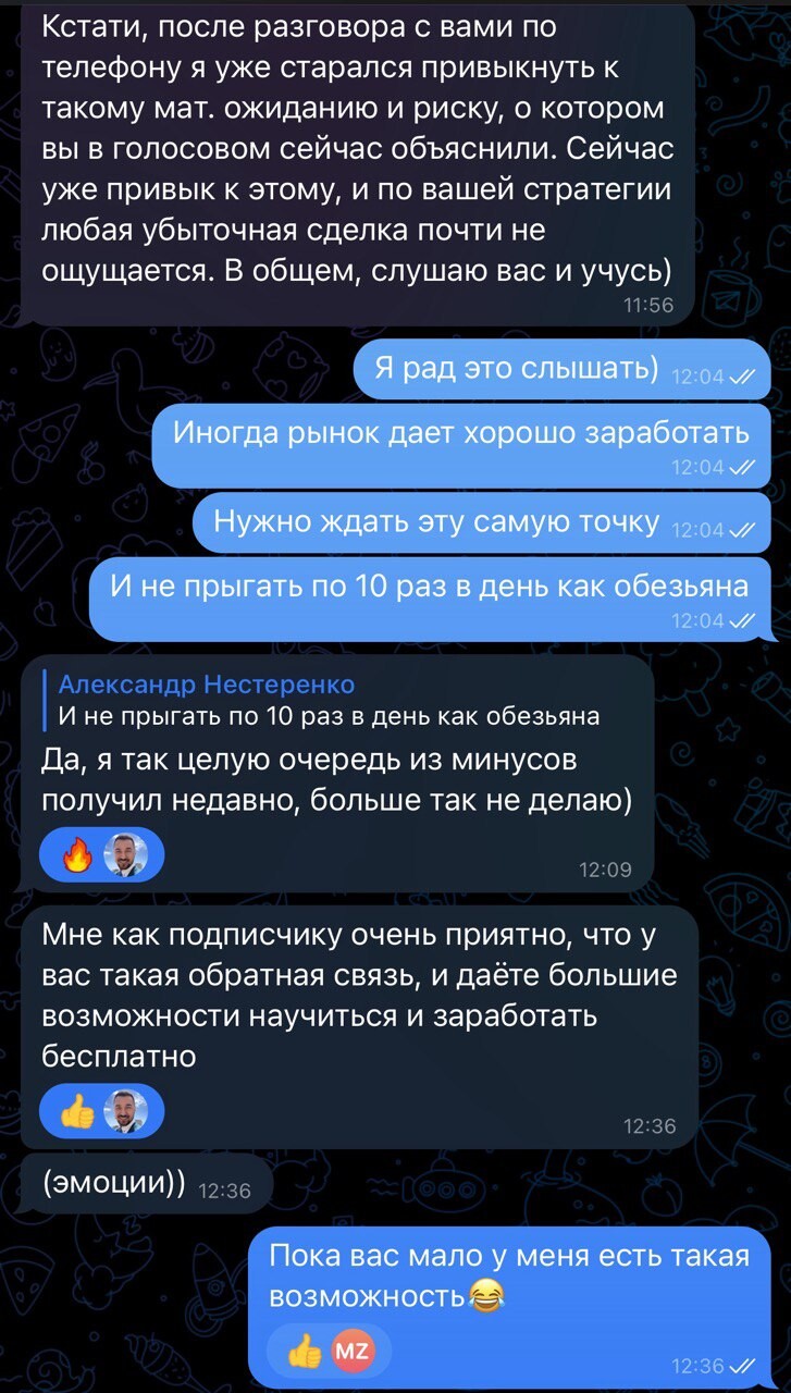Благодаря торговле в реальном времени и объяснении своих действий подписчики начали лучше понимать рынок и торговать более системно. Тот большой опыт, который я накопил и которым делюсь со всеми помогает избегать грубых ошибок и добиться своих целей в торговле быстрее.