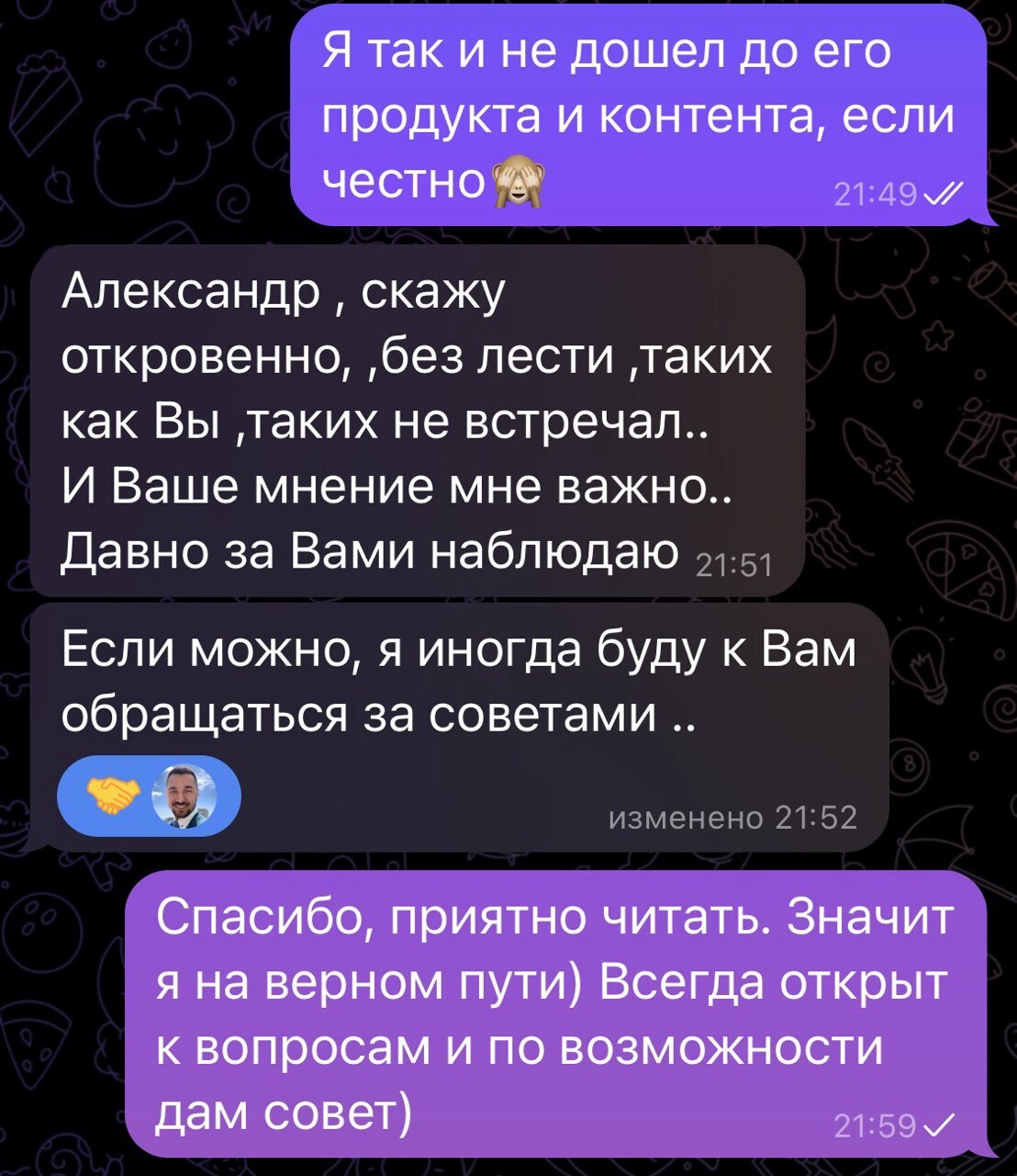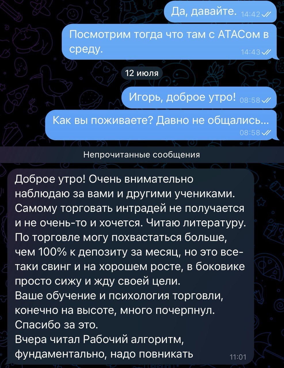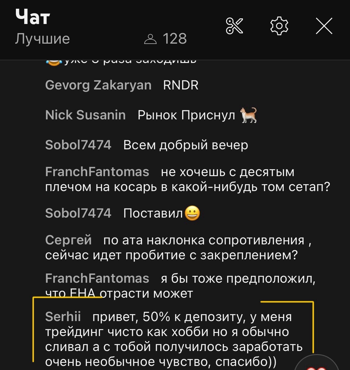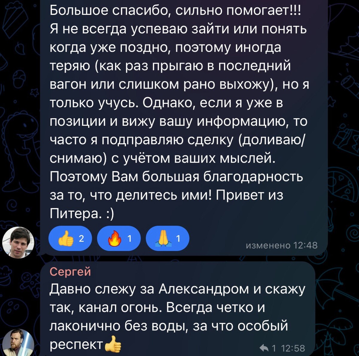 Благодаря торговле в реальном времени и объяснении своих действий подписчики начали лучше понимать рынок и торговать более системно. Тот большой опыт, который я накопил и которым делюсь со всеми помогает избегать грубых ошибок и добиться своих целей в торговле быстрее.